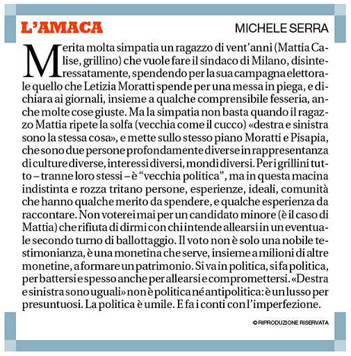 Caro Michele, so che ti interesserà poco, ma mi trovo d’accordo con te… credo praticamente sempre. Citando Hegel, la lettura del giornale è la preghiera dell’uomo moderno, e sono felice di poter celebrare spesso il mio risveglio con il “Michele Serra nostro”. Credo ci siano due modi per poterti dimostrare quanto sono grato per la lucidità che provi a regalarci: regalarti qualche percentuale di royalties comprando i tuoi libri (consiglio novità: clicca qua) e provare a diffondere le tue perle. Non volermene quindi se un po’ me ne sbatto di quel “riproduzione riservata” (che fa tanto web 1.0) che sta in calce alle tue amache e mi permetto di scansionare e riproporre i tuoi pezzi. Ma dopo il lucidissimo punto di vista su Grillo e i grillini di qualche settimana fa e il bellissimo pezzo in difesa della memoria degli anni di piombo e delle vere vittime, bruciate ingiustamente nella fornace propagandistica del biscione, non potevo esimermi da quest’altra segnalazione. Perché nonostante il grigiore e il pessimismo tipicamente sinistrorso che mi attanaglia, retaggio di un paio di generazioni paterne di militanza, mi ha fatto sorridere di ottimismo.