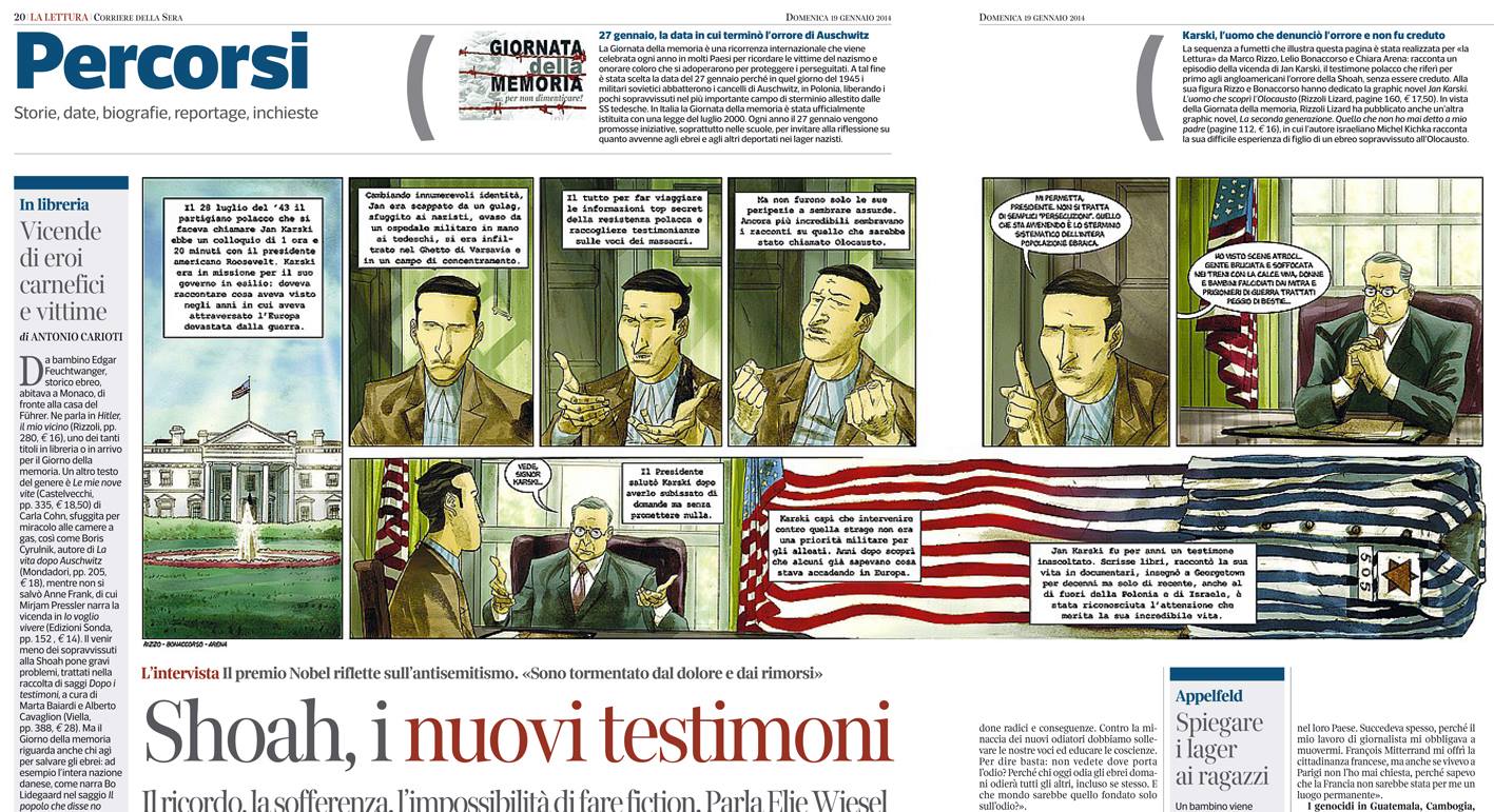 Per La Lettura, il supplemento culturale del Corriere della Sera, abbiamo realizzato una tavola ad hoc dall’insolito formato orizzontale per raccontare l’incontro cruciale di Jan con il presidente F.D. Roosevelt: gli raccontò degli orrori della guerra, visti con i propri occhi mentre faceva da corriere per la Resistenza Polacca e quando si infiltrò prima nel Ghetto di Varsavia poi nel campo di Izbica-Lubelska.